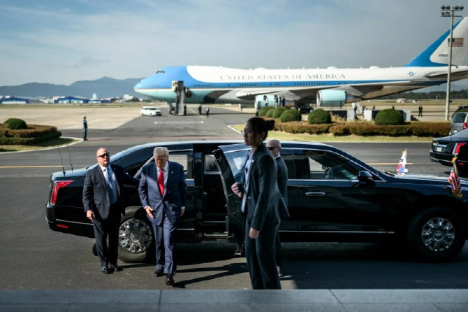 사진 모음의 맨 앞에는 경호원들이 근처에 배치된 상태에서 짙은 파란색 양복에 빨간 넥타이를 한 트럼프 대통령이 승용차에서 내려서 건물 입구로 들어오는 모습이 담겼다. 사진첩의 뒷부분에는 회담을 마치고 회담장에서 나온 트럼프 대통령이 레드 카펫을 밟으면서 대기중이던 에어 포스 원에 오른 후 손을 흔들며 작별 인사를 하는 것으로 추정되는 모습이 담겼다.저작권자 © 이데일리 & 이데일리TV - 상업적 무단전재 & 재배포 금지