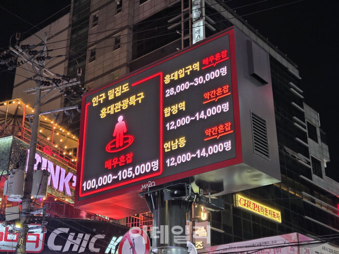 31일 오후 10시 홍대에 방문한 인파가 10만5000명을 넘어섰다는 안내가 나오고 있다. (사진=염정인 기자)