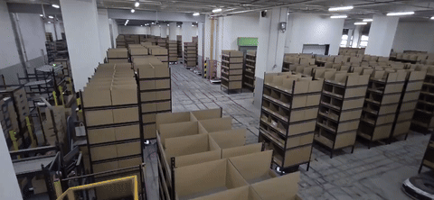 CJ대한통운 군포센터 스마트층에서 AGV가 상품 선반을 작업자에게 이송하고 있다. (사진=한전진 기자)