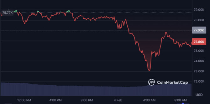 4일 코인마켓캡에 따르면 이날 오전 9시30분 현재 비트코인 가격은 24시간 전보다 3.68% 내린 7만5916달러 수준에서 거래되고 있다. 비트코인은 한때 7만2000달러대까지 하락했다. 이는 2024년 11월6일 이후 15개월 만에 최저치다.