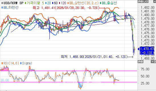 [이데일리 유준하 기자] 원·달러 환율이 개장과 동시에 1480원을 돌파하더니 이재명 대통령의 신년 기자회견 발언으로 재차 급락, 1460원 후반대까지 떨어졌다. 환율이 장중 1460원대를 보인 것은 4거래일 만이다.
