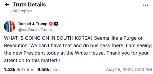 트럼프 대통령은 이날 자신의 사회관계망서비스(SNS) 트루스소셜에서 “대한민국에서 지금 무슨 일이 일어나고 있느냐”라면서 “숙청(purge)이나 혁명처럼 보인다. 우리는 그런 상황에서 사업할 수 없다”고 밝혔다.