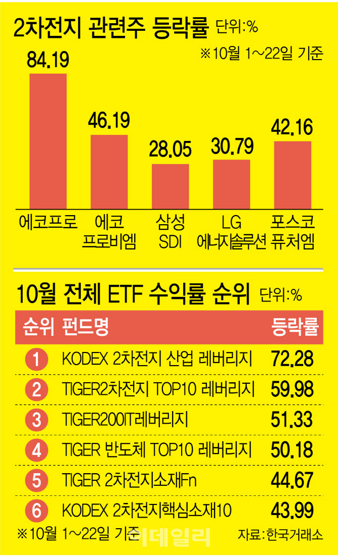 2차전지 관련주 전반이 상승하자 이들 종목을 담고 있는 상장지수펀드(ETF)도 최근 한 달간 높은 수익률을 기록했다. 10월 ETF 수익률 1위를 기록한 상품은 ‘KODEX 2차전지산업 레버리지’ ETF로 한 달간 72.28% 급등했다. 이밖에 수익률 10위권 안에는 2차전지 테마 ETF 상품 6개가 이름을 올렸다.